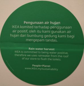 笔者最近到宜家逛逛的时候,就看见洗手间里贴着这么一张告示,说明用来冲洗马桶的水源,是来自商店屋顶所收集的雨水,以实际行动响应公司的可持续发展目标。
