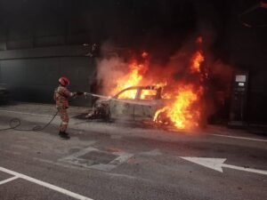 2023年12月31日,柔佛新山汽车展销中心外充电中的电动车不知何故起火燃烧,造成车身近90%烧毁。