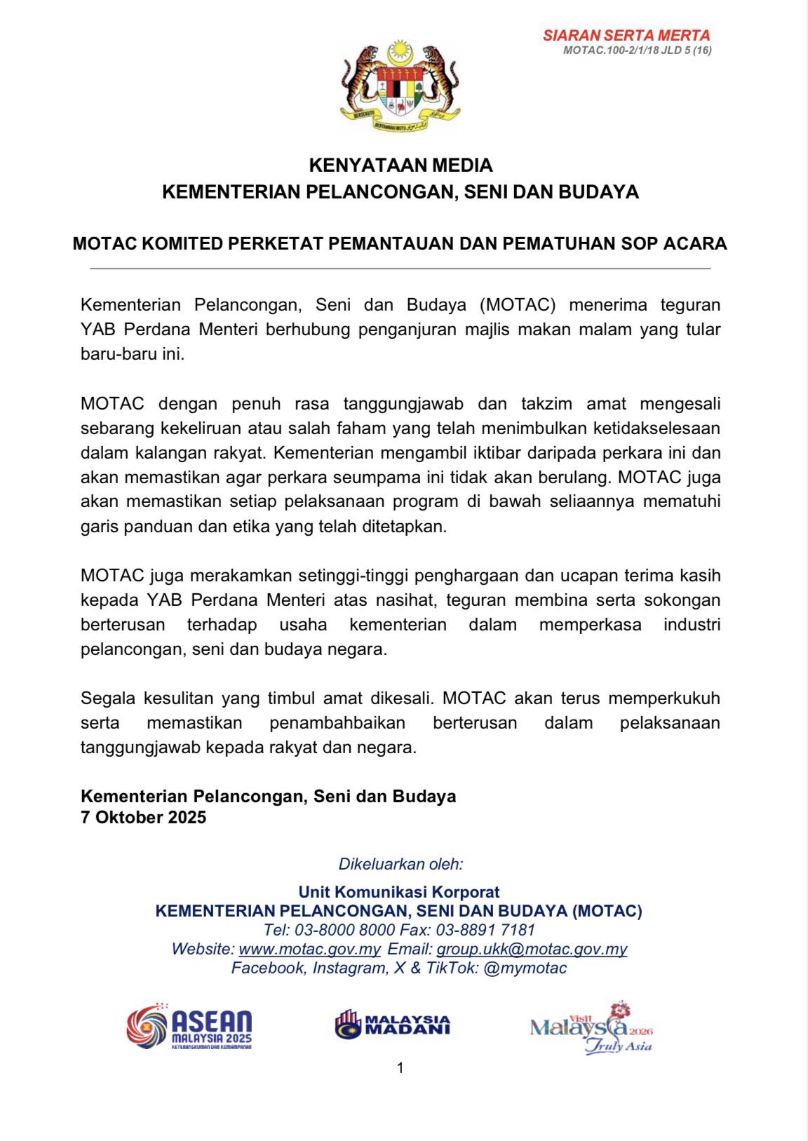 MOTAC也表示,将确保未来所有由该部主办或监督的活动严格遵守既定方针与道德规范,同时感谢首相给予的指导与支持,促使该部继续推动旅游与文化产业的发展。