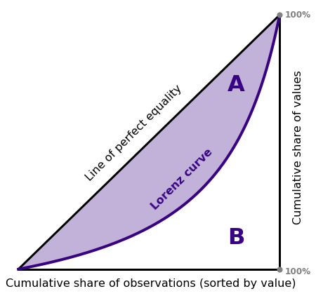 如果收入完全平等,曲线是一条45度的直线。基尼系数就是洛伦兹曲线与完全平等线之间的面积占整个三角形面积的比例。