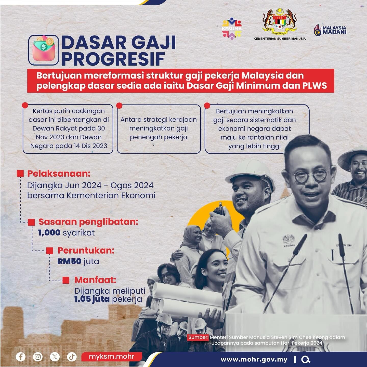 人力资源部长沈志强表示,《渐进式薪金政策》将从2024年6月开始实施,预计投入5000万马币,惠及超过一百万工人。这项政策是对现行最低工资政策的扩展,计划通过提高工资和改善工作环境来增强劳动者的生活质量。