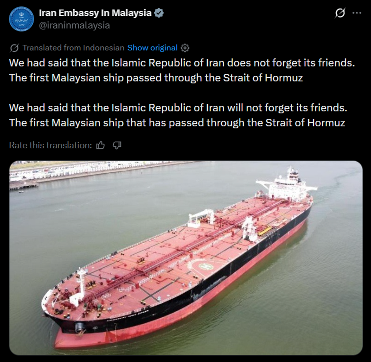 伊朗驻马来西亚大使馆在社媒X上传一张船只的照片,并配文说:“我们曾说过,伊朗不会忘记他的朋友。第一艘大马船只已通过霍尔木兹海峡。”