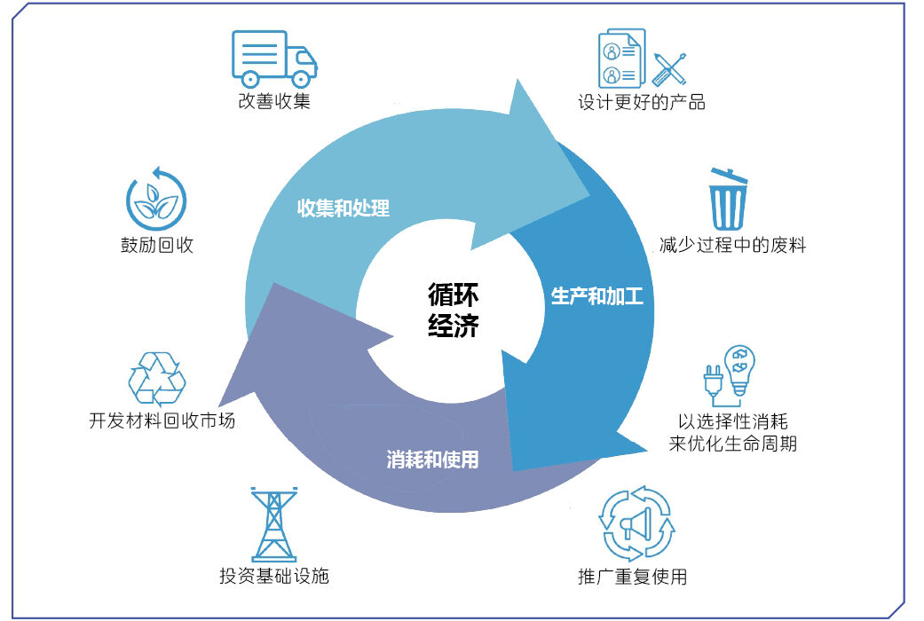 相比之下,循环经济(Circular Economy)是一种更可持续的经济模式。该模式通过设计构思物品或服务的整体流程,采用再循环的方式,使产品或服务能够再生。